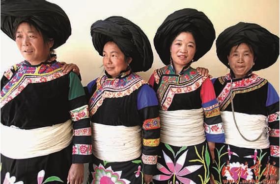 四川省凉山彝族自治州的彝族妇女身披白色坎肩,头戴荷叶帽。