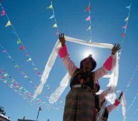 藏族自古崇尚白色,认为白色是纯洁、吉祥、诚挚、善良、正义和繁荣的象征。藏族崇尚白色由来已久,先民们把羊毛挂在门楣和各种器皿上;山口、要道的嘛呢石堆上放白色石头;插箭祭“拉则”(山神的居所)时,在箭杆上系白色羊毛等等,无处不见白色崇拜的印记,藏族居住的青藏高原人们习惯称做雪域,作为最常见的景物伴随着民族漫长的历史,白色更自然地进入藏民族的审美观念中,渗入藏民族的灵魂深处。