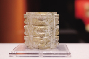 位于浙江杭州余杭区的良渚遗址,是考古实证中华文明史的典范。良渚文化玉器发达,玉琮和玉璧是其重要代表。展览中的这件玉琮出土于反山遗址12号墓,内圆外方,器型规整,共有三节,雕刻简化的神人兽面纹,纹饰类似后世青铜器“三层花纹”,制作工艺已使用拉丝、管钻、锯切等技术,减地浅浮雕手法,满密的阴线刻,精细的器表打磨剖光技术,均表现了良渚玉器的高度成就。