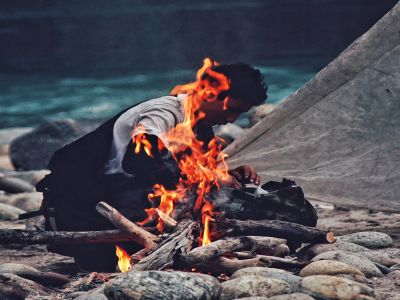 在河边扎营的放映员